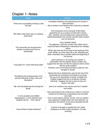 Jane Eyre Chapter 1 Quotes And Analysis Teaching Resources